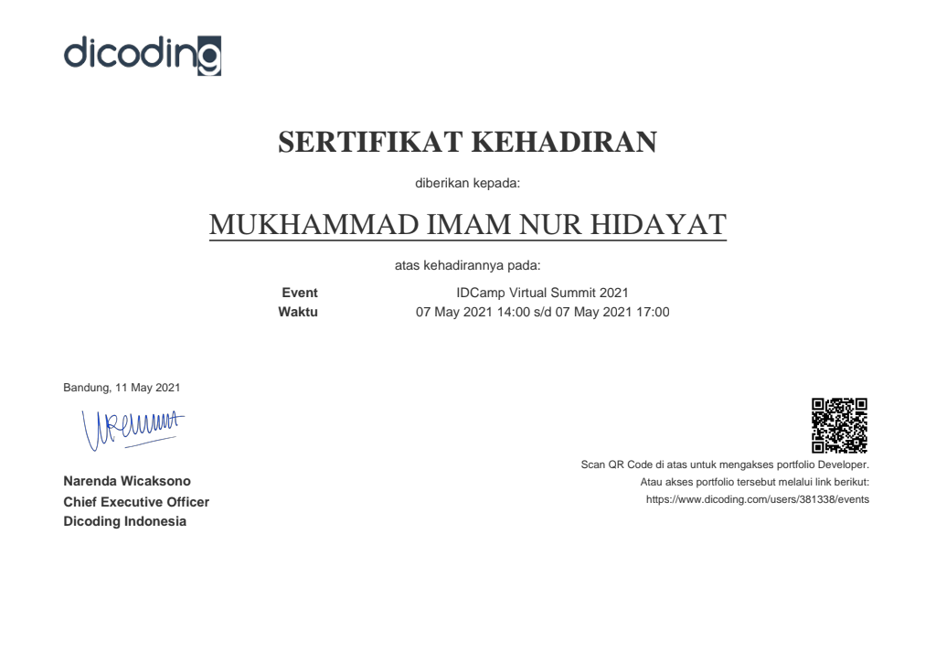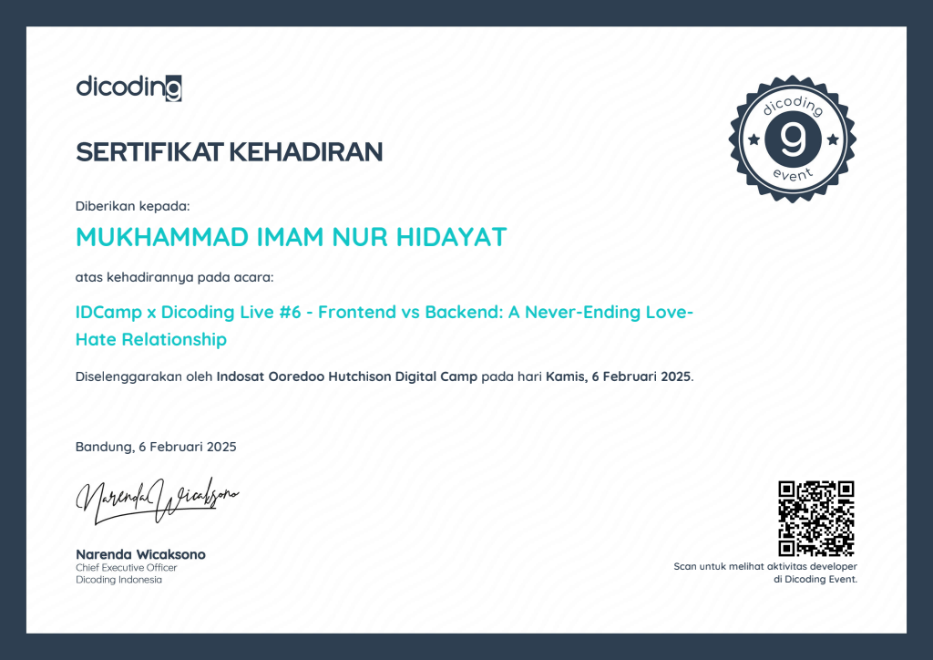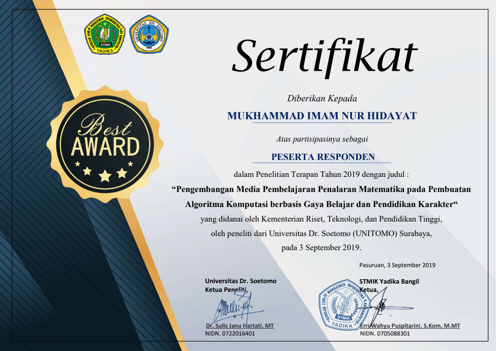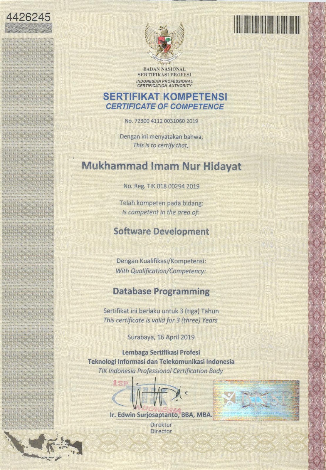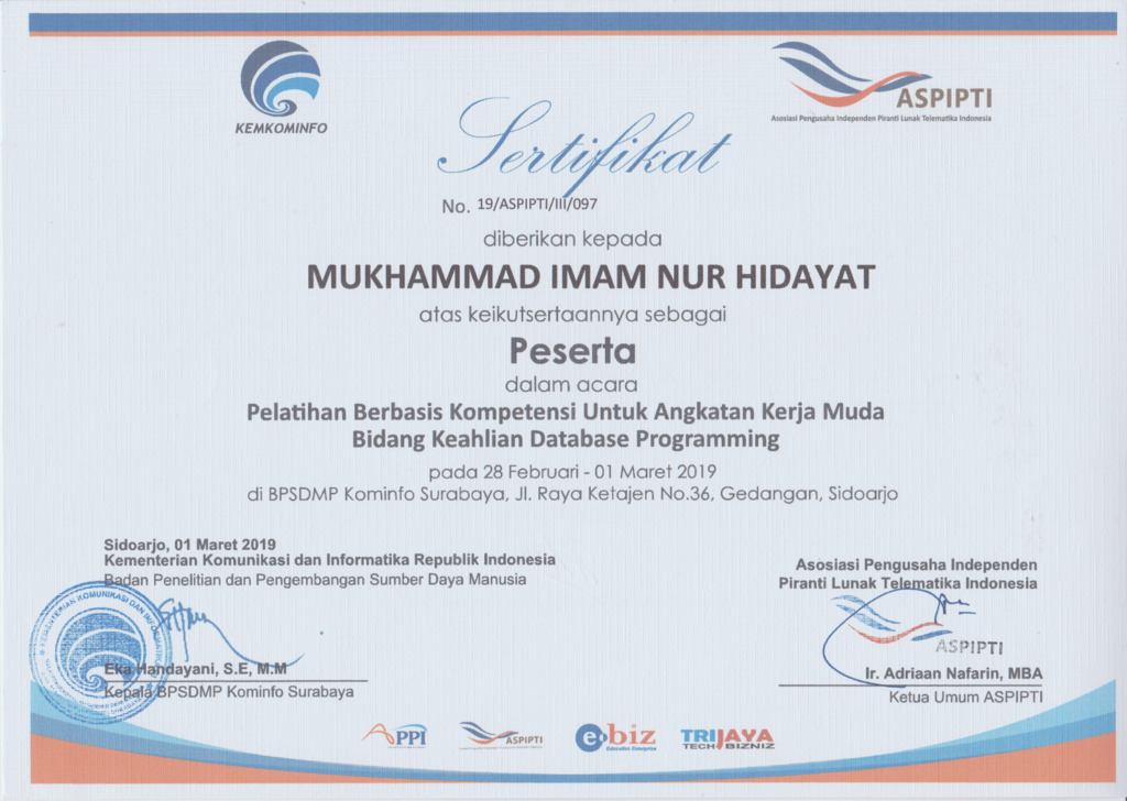 Sertifikasi Kompetensi Klaster Database Programming dari LSP TIK Indonesia, mengakui kemampuan dalam: mengimplementasikan pemrograman terstruktur, memanfaatkan library/komponen pre-existing, menggunakan SQL untuk operasi data dan prosedur, menerapkan akses basis data, serta membuat dokumentasi kode program sesuai standar industri..