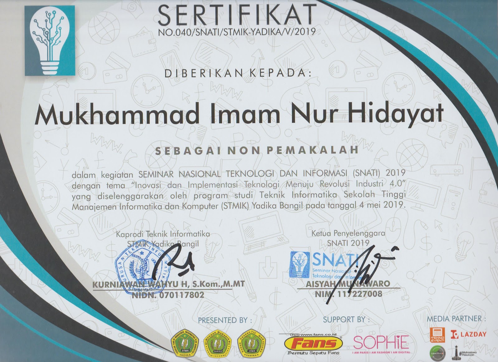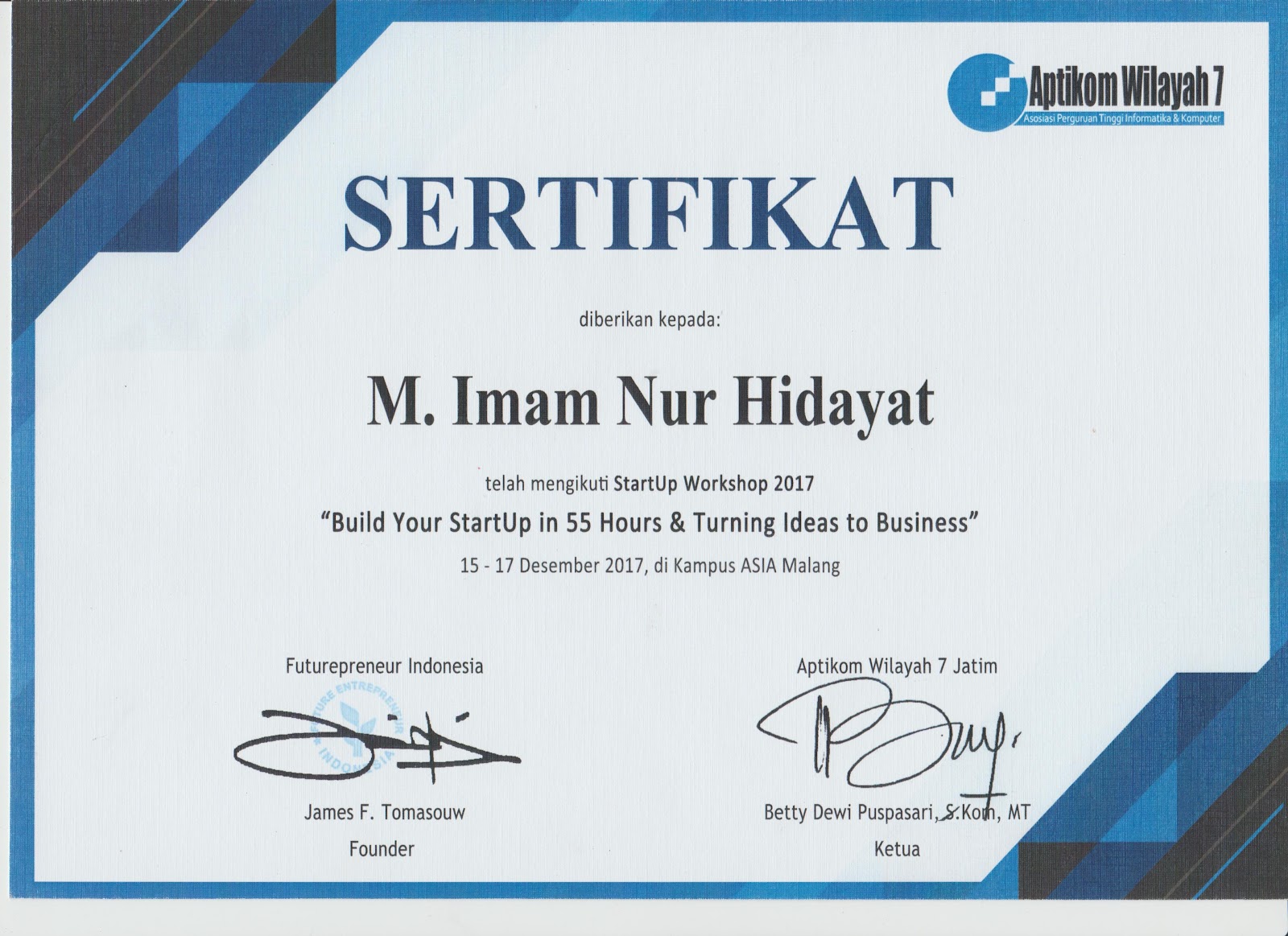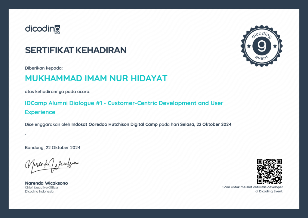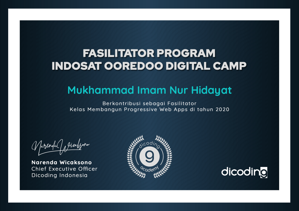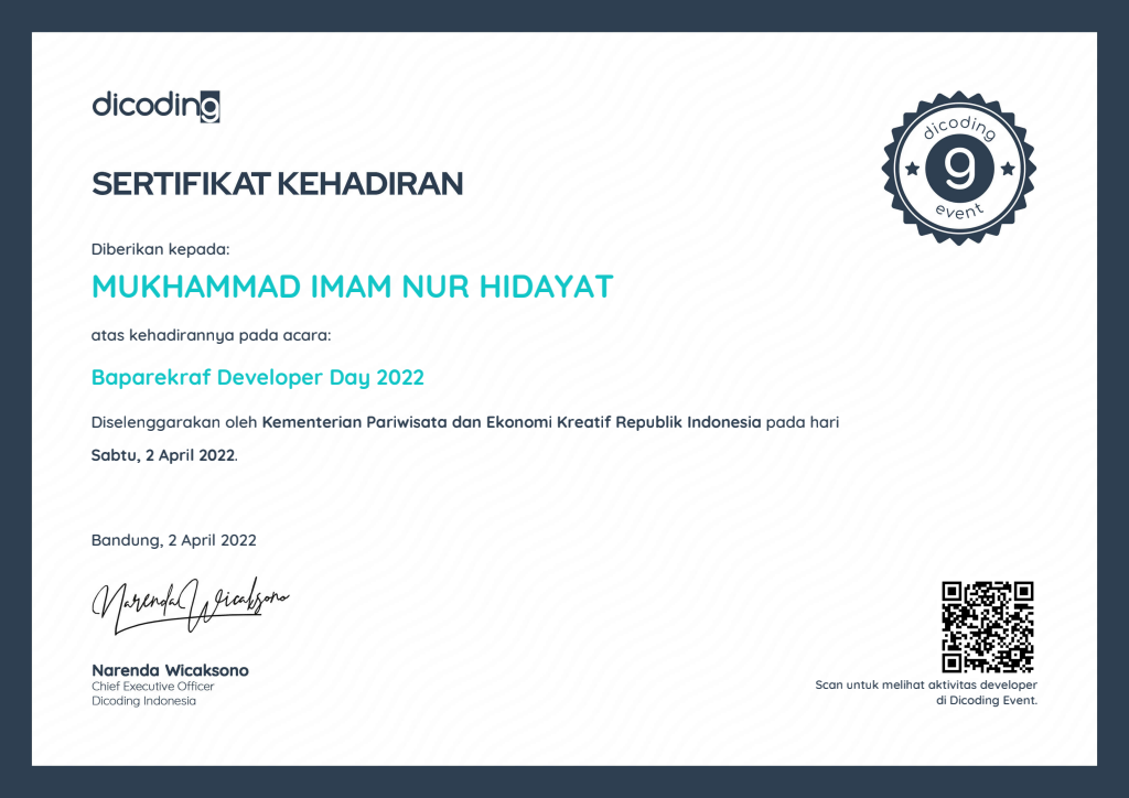 Sertifikasi Kompetensi Klaster Database Programming dari LSP TIK Indonesia, mengakui kemampuan dalam: mengimplementasikan pemrograman terstruktur, memanfaatkan library/komponen pre-existing, menggunakan SQL untuk operasi data dan prosedur, menerapkan akses basis data, serta membuat dokumentasi kode program sesuai standar industri..