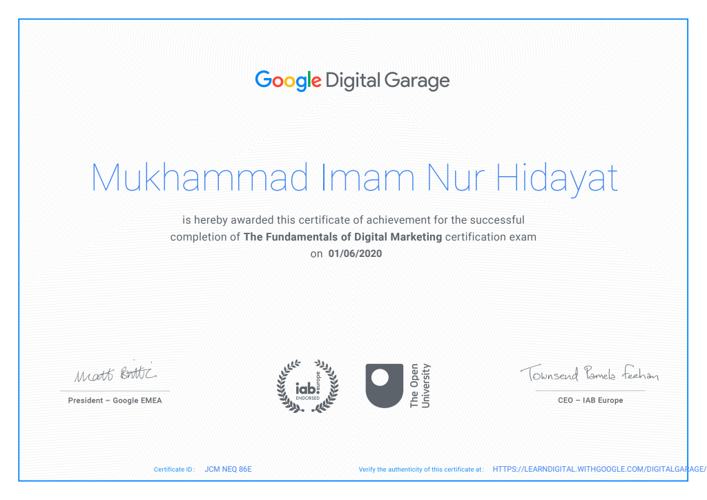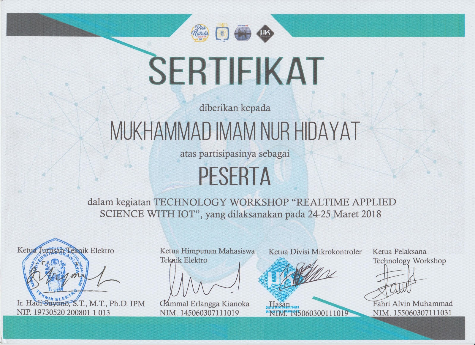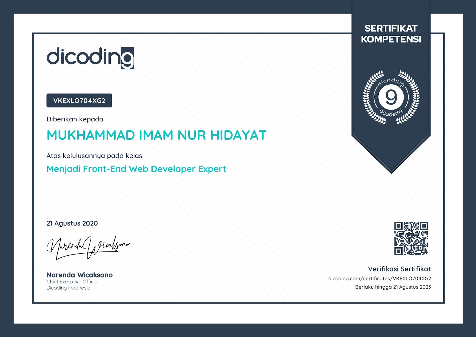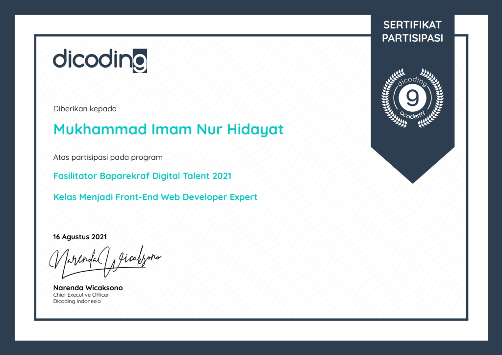 Sertifikasi Kompetensi Klaster Database Programming dari LSP TIK Indonesia, mengakui kemampuan dalam: mengimplementasikan pemrograman terstruktur, memanfaatkan library/komponen pre-existing, menggunakan SQL untuk operasi data dan prosedur, menerapkan akses basis data, serta membuat dokumentasi kode program sesuai standar industri..